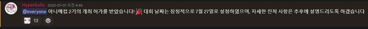대충 내한 다보고 뒤풀이로 치킨을 뜯었는데, 그러면서 gubshig님과 djm03178님에게 "하볼님 럽라컵 언제 여세요?"같은 얘기를 들었습니다. 개인 대회를 생각하고 있었던지라 "어?"싶었고 그런데 럽라로 10문제 넘게 내는건 또 힘들어서 전전긍긍하다가 그당시 solved.ac 디스코드에서 계속 얘기 나오던 "아니메컵 2기 언제 열려요"글을 보고 이거다 싶어서 그냥 감정이 앞서서 아니메컵 2기를 내가 열까? 생각하게 되었습니다. 그러지 말았어야 했는데